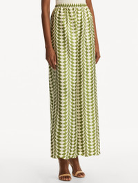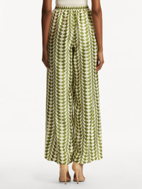 These silk twill wide-leg pants, printed with a striking geometric design, offer a fresh take on classic daywear. With a fluid, relaxed fit and vibrant print, they pair effortlessly with the coordinating blouse. Details - High Waisted - Elastic Waist - Side Seam Pockets - Wide Leg Silhouette - Scallop Trim - Unlined - Style Code: 25PN319GSL_FIV - Country of Origin: Italy Materials & Care - 100% Silk