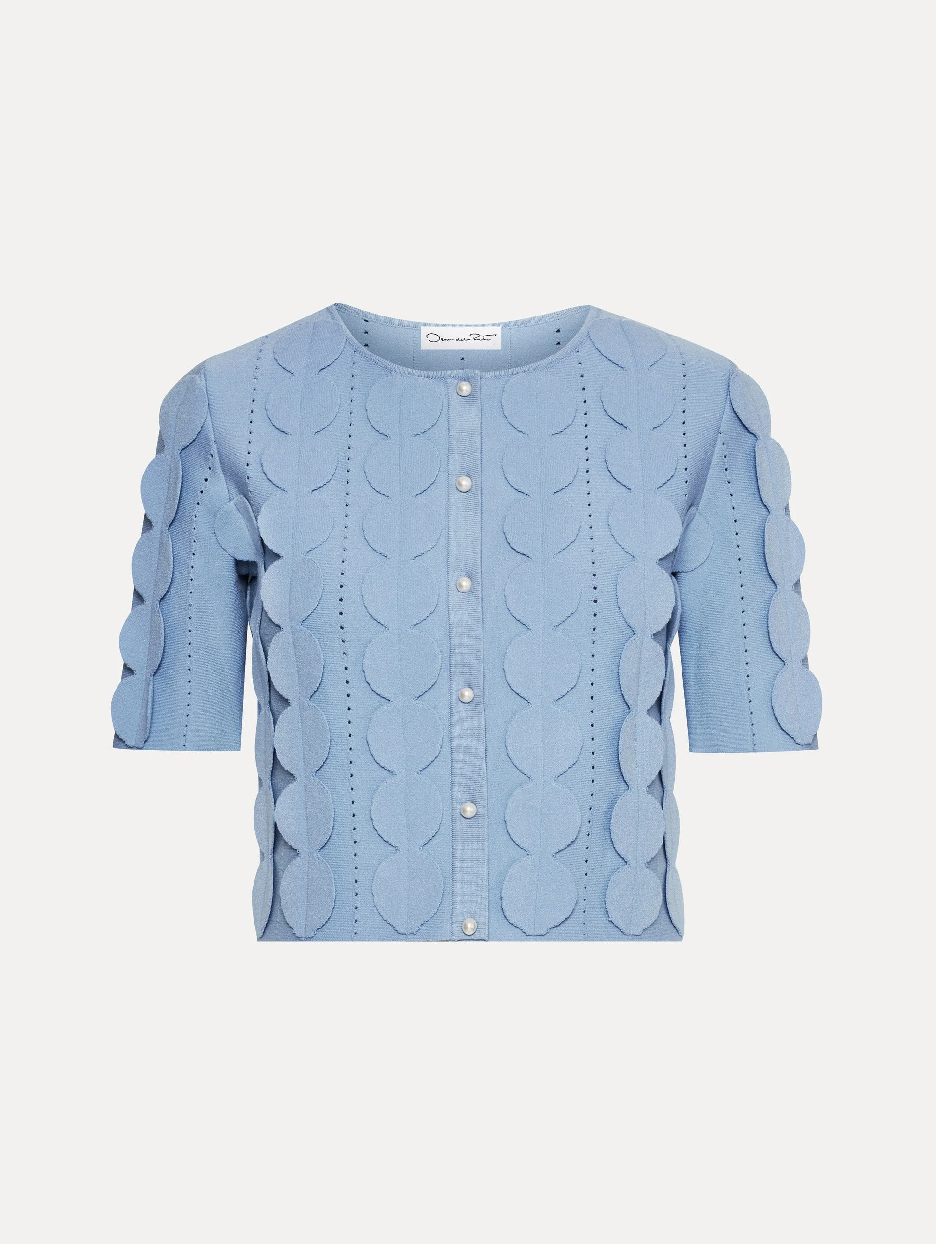 Cropped cardigans are enjoying their moment in the sun amongst the fashion set. Especially dynamic with three-dimensional scalloped detailing, it's a comfortable and effortless overlayer designed to enhance. Details - Short Sleeves - Jewel Neckline - Cropped Length - Snap Button Front - Unlined - Style Code: 25SN174CIR_OPA - Country of Origin: Italy Materials & Care - 66% Viscose, 28% Polyester, 4% Polyamide, 2% Elastane