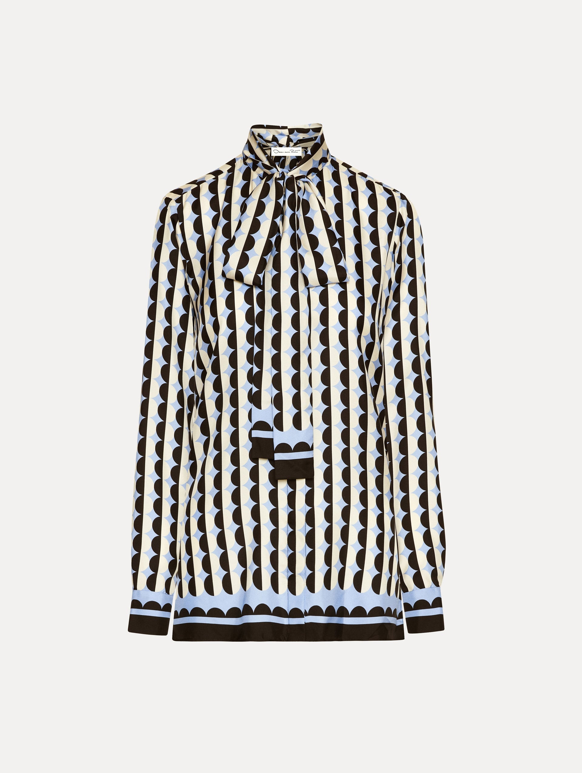 This blouse features a Mod geometric circle motif, creating a bold visual effect with its contrasting colors. The playful pattern is balanced by classic details, making it a versatile piece that transitions seamlessly from day to evening wear. Details - Long Sleeves with Button Cuffs - Banded Collar with Removable Self-Tie Closure - Concealed Button Front - Relaxed Silhouette - Unlined - Style Code: 25SN713ACS_BLB - Country of Origin: Italy Materials & Care - 100% Silk