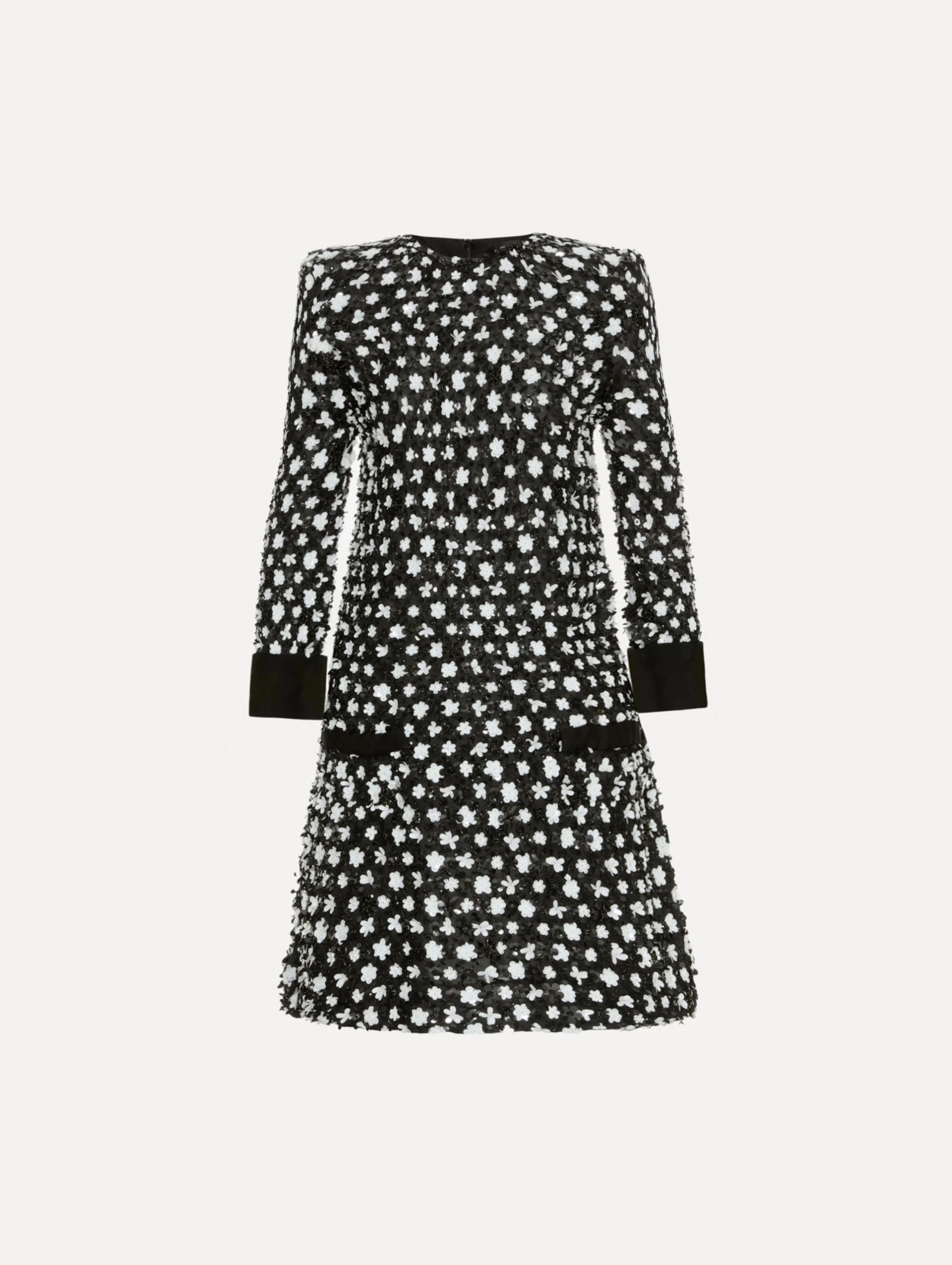 Tweed is reimagined through intricate sequin embroidery, where nested ivory and noir florets create a textural pattern across this dress—bringing luminous dimension to this daywear staple. Details - Three-Quarter-Length Sleeves - Jewel Neckline - Shift Silhouette - Non-Functional Front Patch Pockets - Concealed Back Zipper - Lined - Style Code: 25FE227GGT_BLK - Country of Origin: Italy Materials & Care - Lining: 100% Silk - Spot clean only. - Do not dry clean, iron, steam, bleach, or wash.