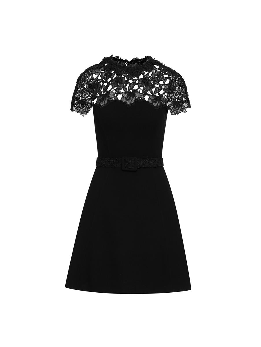 A STAPLE SILHOUETTE IN EVERY WOMAN'S WARDROBE, THIS LITTLE BLACK DRESS IS DEFINED BY EXQUISITE FLORAL GUIPURE LACE AT THE NECKLINE THAT FALLS TO THE SHORT SLEEVES. COMPLETED WITH A COORDINATING BUCKLE BELT FOR OPTIMAL FEMININE FRAMING, THIS MINI IS A GO-TO FAVORITE. JEWEL NECK / SHORT SLEEVES / COORDINATING BUCKLE BELT / DRY CLEAN DIMENSIONS: MODEL IS 5'11" / 180 CM AND WEARING SIZE 2 MATERIAL: 94% VIRGIN WOOL 5% ELASTANE 1%POLYAMIDE MADE IN ITALY STYLE 23RN243DSW_BLK