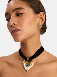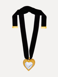 A faceted crystal heart sits framed in a hammered gold-tone setting, suspended from a plush black velvet ribbon designed to tie at the neck. Pair with the coordinating brooch. Details - Dimensions: 54 x 500 mm - Weight: 72 grams - Country of Origin: Italy - Style Code: R26J813_CRT Materials & Care - 97% Brass, 2% Plexi, 1% Velvet - Avoid exposing your jewelry to harsh chemicals. - Lotions, cosmetics, hairspray and perfumes can cause chemical reactions that can cause the finish to deteriorate. - Before handling, washing hands after applying makeup and hair products will help to preserve the finish. - Do not wear in the pool, on the beach or in the shower. - Wipe away dirt and body oils with a slightly damp microfiber jewelry cloth or cotton ball and allow to dry. - Store separately in cloth pouches or small boxes to minimize scratching.