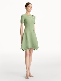 This dress is defined by its meticulously placed ivy vine cutouts and tonal applique detailing. The softly flared skirt and scalloped hem create fluid movement, while the precise knit construction offers a refined, body-skimming fit. Details - Short Sleeves - Jewel Neckline - Fit-and-Flare Silhouette - Concealed Back Zipper - Unlined - Country of Origin: Italy - Style Code: 26RE112FED_GRN Materials & Care - 67% Viscose, 15% Polyester, 14% Cotton, 3% Polyamide, 1% Elastane - Spot clean only - Do not dry clean, iron, steam, bleach, or wash