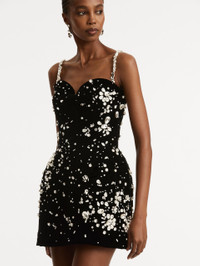 Composed of multi-dimensional stones and scattered across a canvas of deep black velvet, faceted crystal clusters shimmer like constellations in motion—an effect that brings celestial allure to this cocktail mini, defined by its crystal straps and leg-baring hemline. This piece is a result of 115 hours of meticulous handwork, with over 2,000 stones and crystals individually set by skilled artisans. Details - Sleeveless - Sweetheart Neckline - Concealed Back Zipper - Internal Bustier - Petticoat - Lined - Style Code: 25FE621CPV_SLB - Country of Origin: USA Materials & Care - 65% Polyester, 35% Cupro; Lining: 100% Silk - Spot clean only. - Do not dry clean, iron, steam, bleach, or wash.