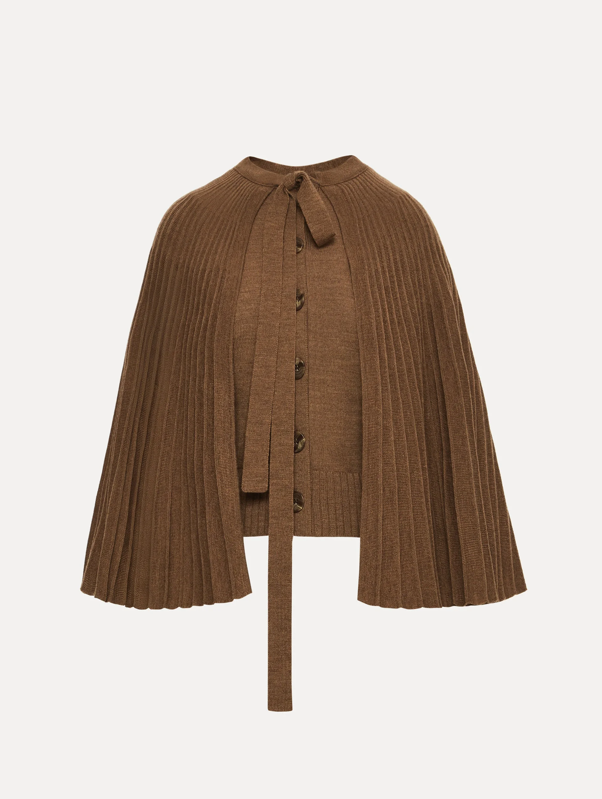 This knit capelet is crafted with a sweeping pleated silhouette that drapes effortlessly over the shoulders. Its fluid shape is anchored by a slender bow tie at the neckline, while the soft, ribbed texture creates a sense of movement. Details - Self-Tie Closure - Cropped Silhouette - Unlined - Country of Origin: USA - Style Code: 26RN165CCA_BRN Materials & Care - 100% Virgin Wool - Dry clean only.