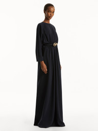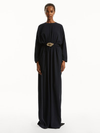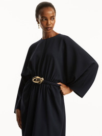 Cut from heavy silk stretch georgette, this caftan drapes effortlessly with long sleeves and a flowing silhouette that exudes understated elegance. A sculptural gold-tone knotted belt cinches the waist, adding a polished finishing touch. Details - Long Sleeves - Jewel Neckline - Relaxed Silhouette - Removable, Coordinating Novelty Belt - Floor - Sweeping Hemline - Concealed Back Zipper - Gold-Tone Hardware - Unlined - Style Code: 25PN907HSG_NAV - Country of Origin: USA Materials & Care - 94% Silk, 6% Elastane