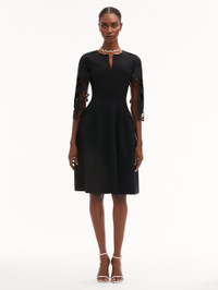 Tailored from double-faced stretch wool, this split neck dress features figure-flattering seams that lead to soft pleats, creating a softly flared skirt. With orchid embroidered split sleeves, this must-have style is imbued with botanical charm. Details - Three-Quarter - Length Split Sleeves - Split Neckline - Knee Length - Concealed Back Zipper - Style Code: 25RE656DSW_BLK Materials & Care - 94% Virgin Wool, 5% Elastane, 1% Polyamide