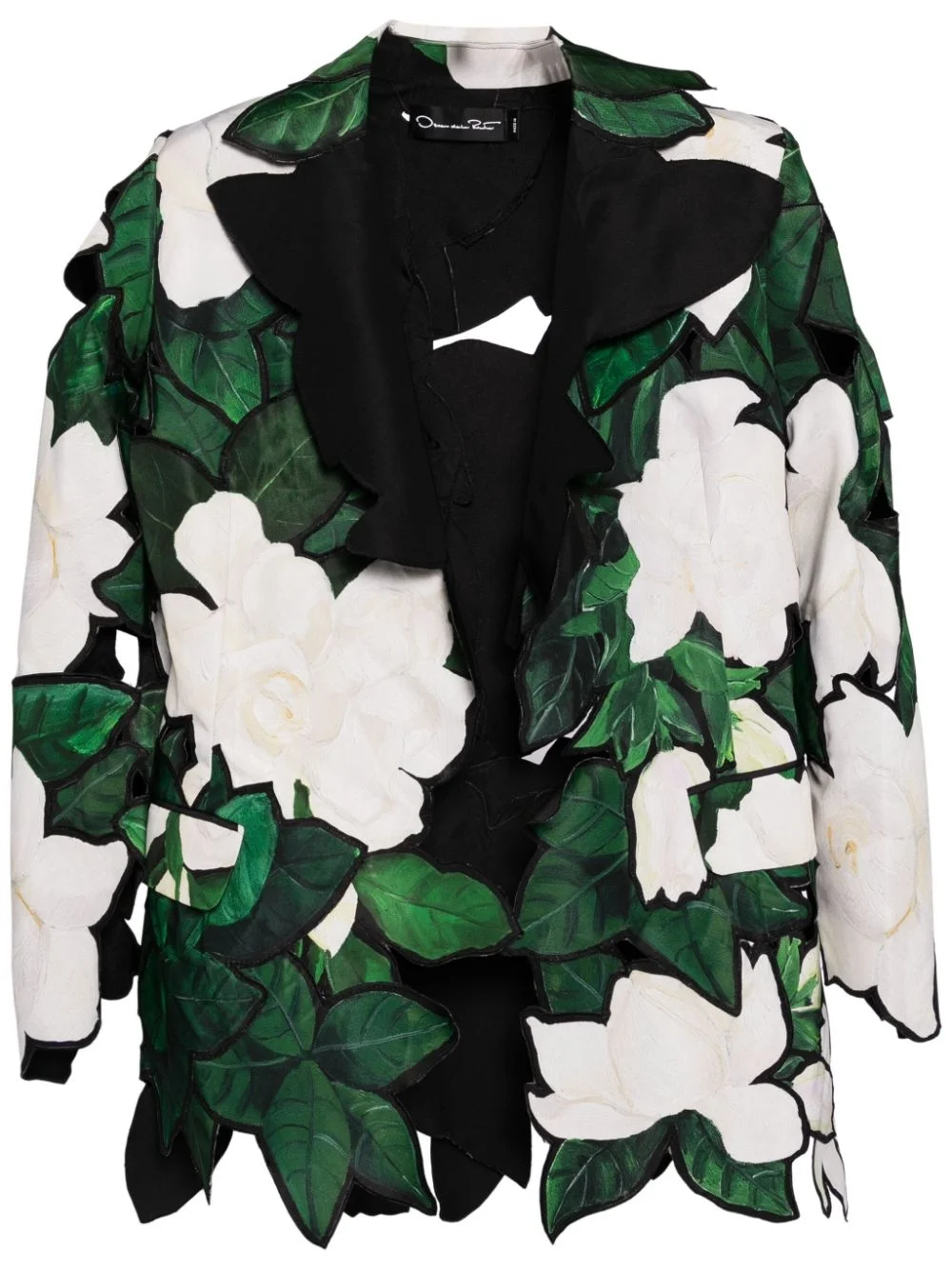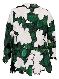 layered-design blazer Highlights - Dark green/off-white/black - Layered design - Floral applique - Notched lapels - Open front - Long sleeves - Asymmetric hem Made in United States Composition Polyester 100%