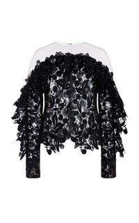 PRODUCT DETAILS - Off the shoulder, ruffled trim, sheer - Concealed zip fastening - Lined - Composition: 100% Polyester; Lining: 100% Silk - Color: Black - Dry clean only - Pre-Fall '25