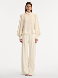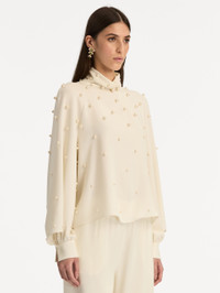 Lustrous pearls are delicately hand-applied across fluid silk georgette, creating a subtle interplay of texture and light. The softly draped silhouette, framed by billowing sleeves and a refined high neckline, exudes understated elegance. Details - Long Sleeves with Button Cuffs - Mock Neckline - Keyhole Back Closure - Pullover Style - Unlined - Country of Origin: Italy - Style Code: 26RE715HSG_IVR Materials & Care - 94% Silk, 6% Elastane - Spot clean only - Do not dry clean, iron, steam, bleach, or wash