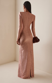 PRODUCT DETAILS - Long sleeve, stretch lame, slim fit, column shape, maxi hem - Concealed zip and hook fastening - Lined - Composition: Self: 73% Viscose, 20% Polyester, 7% Elastane; Lining: 95% Silk, 5% Elastane - Color: Rose Gold - Dry clean only - Fall/Winter '25