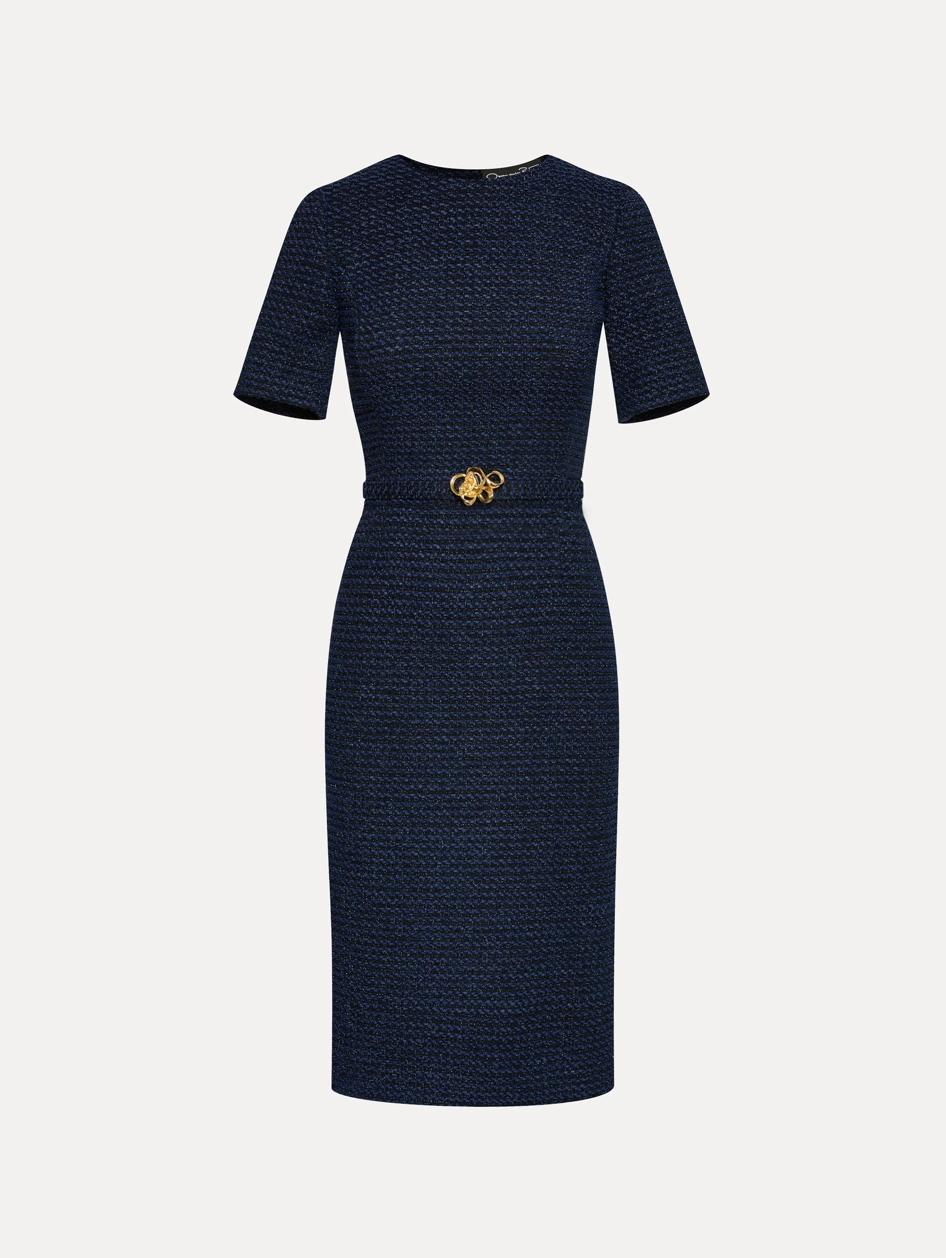 Crafted from lurex check tweed, this timeless dress is finished with an abstract rose gilt belt. Designed with short sleeves, it offers a refined silhouette that effortlessly combines elegance with modern style. Details - Short Sleeves - Jewel Neckline - Below the Knee Length - Removable, Coordinating Novelty Belt with Belt Loops - Concealed Back Zipper - Center Back Slit - Gold-Tone Hardware - Lined - Style Code: 25SN685SUT_NBA - Country of Origin: Italy Materials & Care - 52% Polyester, 20% Polyamide, 18% Viscose, 8% Cotton, 2% Elastane