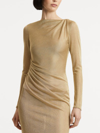 This gown is cut from fluid metallic jersey that glides over the body like molten light. The high neckline and long sleeves strike a note of understated elegance, while artful draping at the shoulder and waist sculpt the silhouette with quiet drama. Details - Long Sleeves - Draped Neckline - Column Shilhouette - Concealed Back Zipper - Center Back Slit - Lined - Style Code: 25FN044MVY_GOL - Country of Origin: USA Materials & Care - - 70% Viscose, 30% Polyester; Lining: 82% Nylon, 18% Elastane - - Dry clean only.