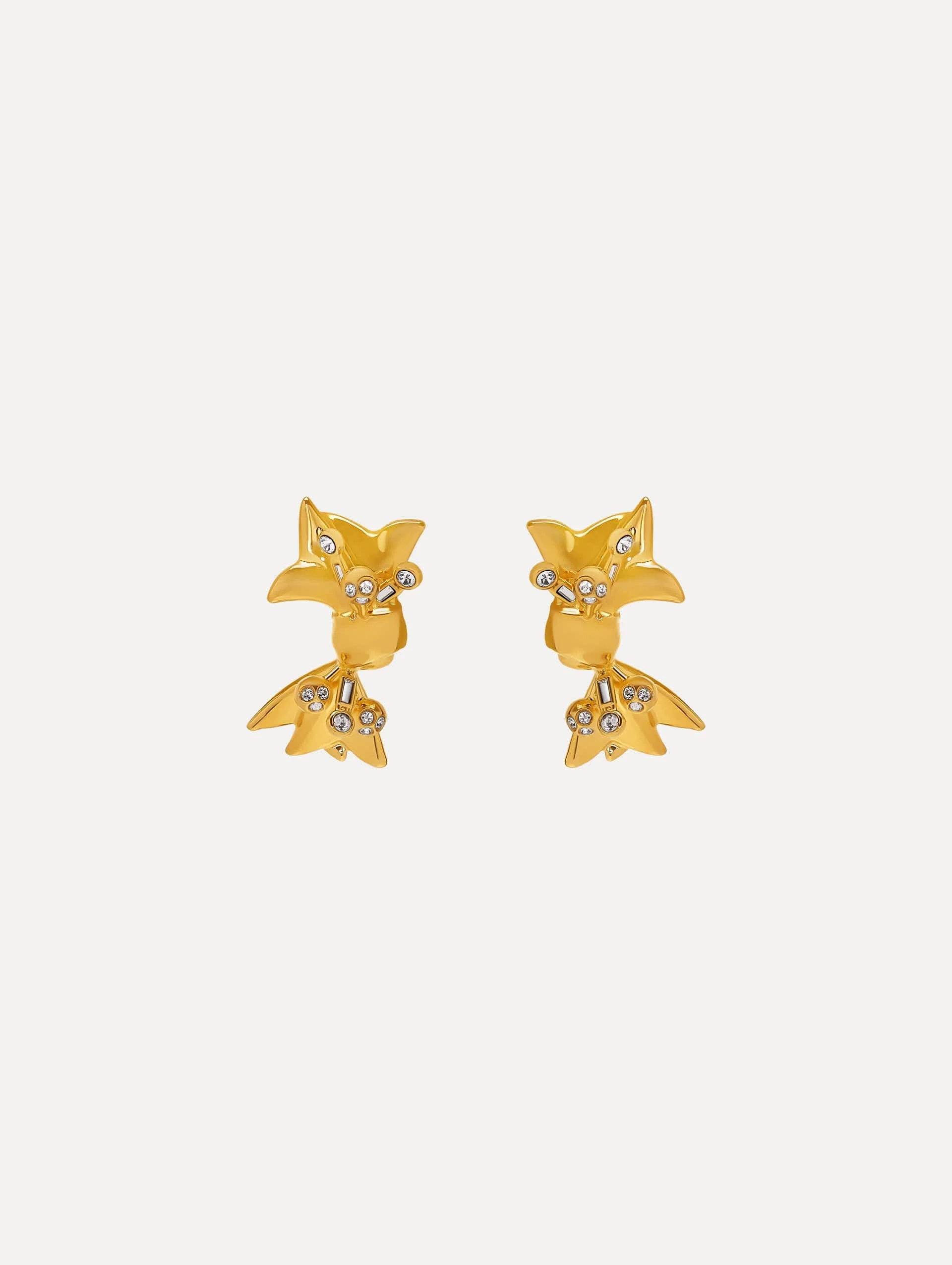 These gold earrings are sculpted into a distinct mill bow design, inspired by the art of millinery. The elegant, fanned shape is accented with glass crystals in varying cuts, adding a refined touch of sparkle. Details - Dimensions: 3.5 cm x 2 cm - Weight: 19 grams - Clip Backs with Comfort Pads - European Glass Crystals - Style Code: P25J905_GOL - Country of Origin: Italy Materials & Care - 98% Brass, 2% Crystal Glass