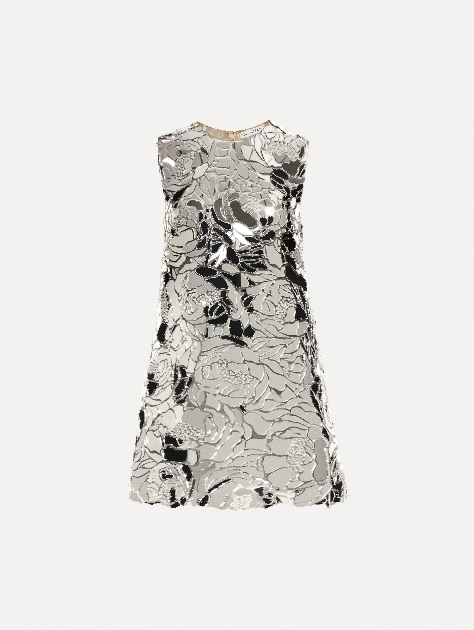The tree peony is celebrated in the house-championed stained glass–inspired embroidery technique—reimagined in mirrored embellishments that reflect light with striking brilliance. Set on a sleek shift silhouette, the season's hero flora shimmers with sculptural clarity. Details - Sleeveless - Jewel Neckline - Shift Silhouette - Concealed Back Zipper - Lined - Style Code: 25FE627TUL_SIL - Country of Origin: USA Materials & Care - - 100% Polyamide; Lining: 100% Silk - - Spot clean only. - - Do not dry clean, iron, steam, bleach, or wash.