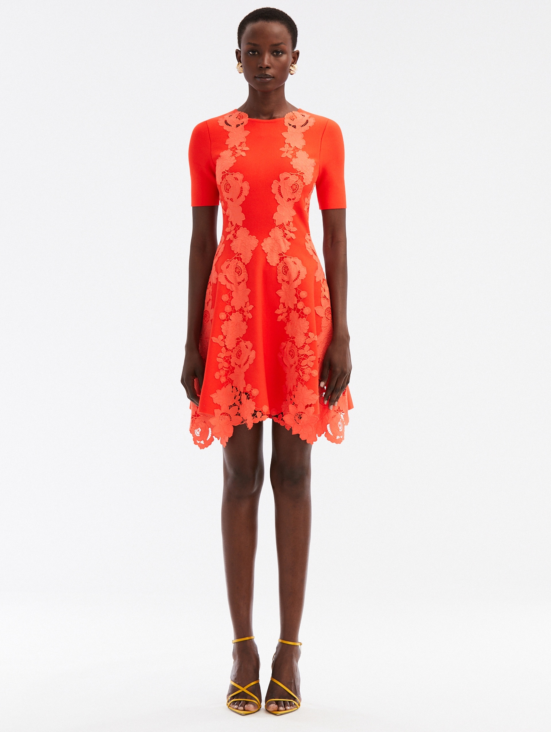 THIS FIT-AND-FLARE DRESS IS A BOTANICAL TAKE ON A CLASSIC MUST-HAVE KNIT. CUT IN A LIVELY SHADE OF TIGER LILY, THIS MINI DRESS FEATURES PERFECTLY PLACED INSETS OF MIXED BOTANICAL GUIPURE LACE. SHORT SLEEVES / ROUND NECKLINE / FIT-AND-FLARE SILHOUETTE / MID-THIGH LENGTH / CONCEALED BACK ZIPPER / UNLINED / DRY CLEAN DIMENSIONS: MODEL IS 5'10.5" / 180 CM AND WEARING SIZE S MATERIAL: KNIT: 72% VISCOSE, 28% POLYESTER; LACE: 70% POLYESTER, 30% COTTON MADE IN ITALY STYLE 24SN112SLI_TIL