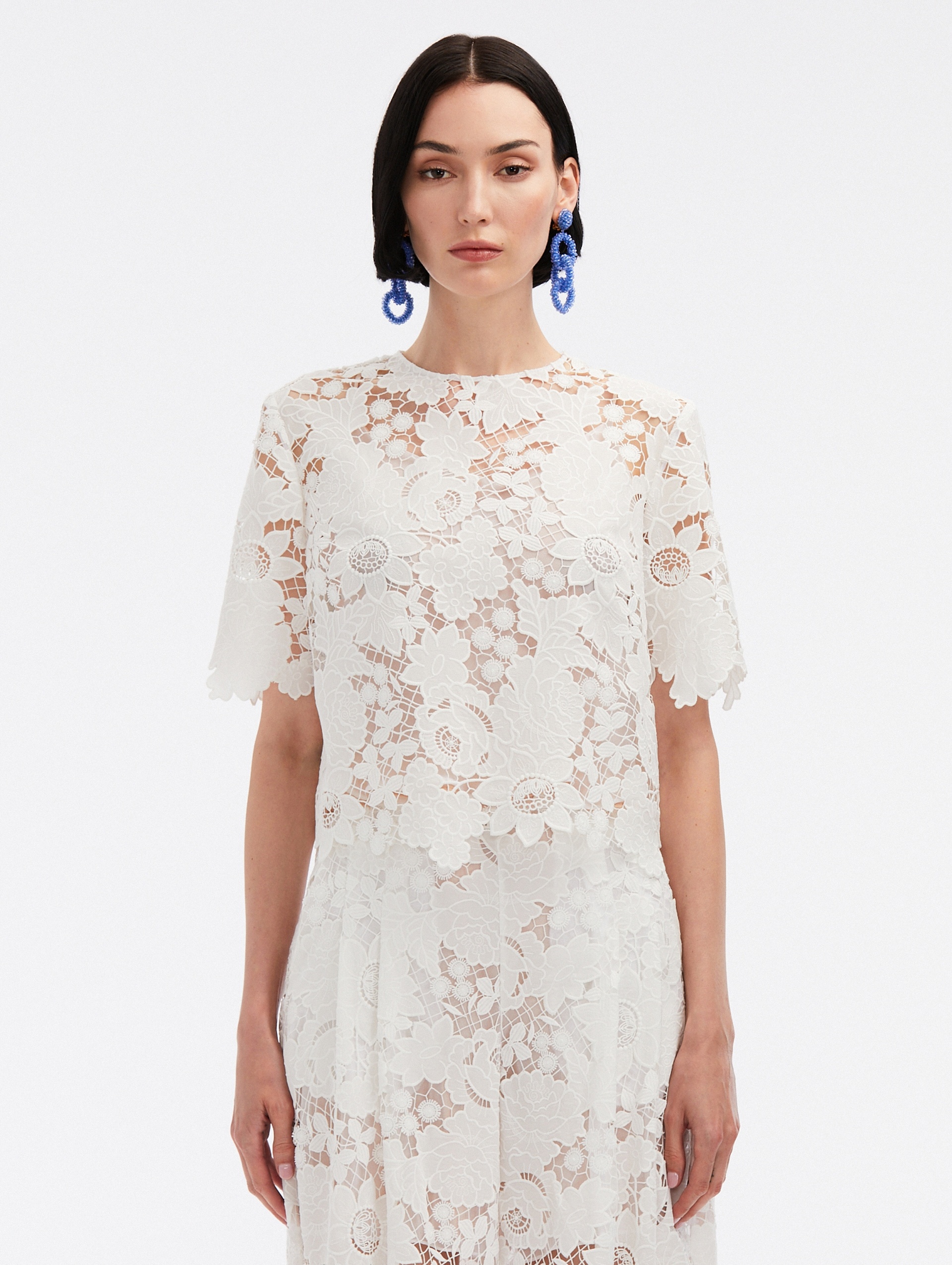 MIXED BOTANICAL GUIPURE LACE IS THE CENTER OF ATTENTION ON THIS CROPPED DESIGN. THIS BLOUSE FEATURES RAW-EDGED TRIM AND A RELAXED SILHOUETTE FOR EASY EVERYDAY STYLING. SHORT SLEEVES / JEWEL NECKLINE / PULLOVER STYLE / CROPPED LENGTH / CONCEALED BACK ZIPPER / SEMI-SHEER / 100% SILK LINING / DRY CLEAN DIMENSIONS: MODEL IS 5'10.5" / 180 CM AND WEARING SIZE 2 MATERIAL: 100% POLYESTER MADE IN ITALY STYLE 24SN740BTG_WHT