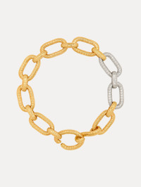 Featuring two-tone links, this exaggerated chain-link design is detailed with a mosaic-like pattern with the icon Oscar 'O' emblem at the center, creating a subtle yet captivating texture. Pair with the coordinating earrings. Details - Dimensions: 42 cm x 2.5 cm x 1.5 cm - Weight: 120 grams - Style Code: S25J801_GOL - Country of Origin: Italy Materials & Care - 99% Bronze, .20% Palladium, .80% Gold