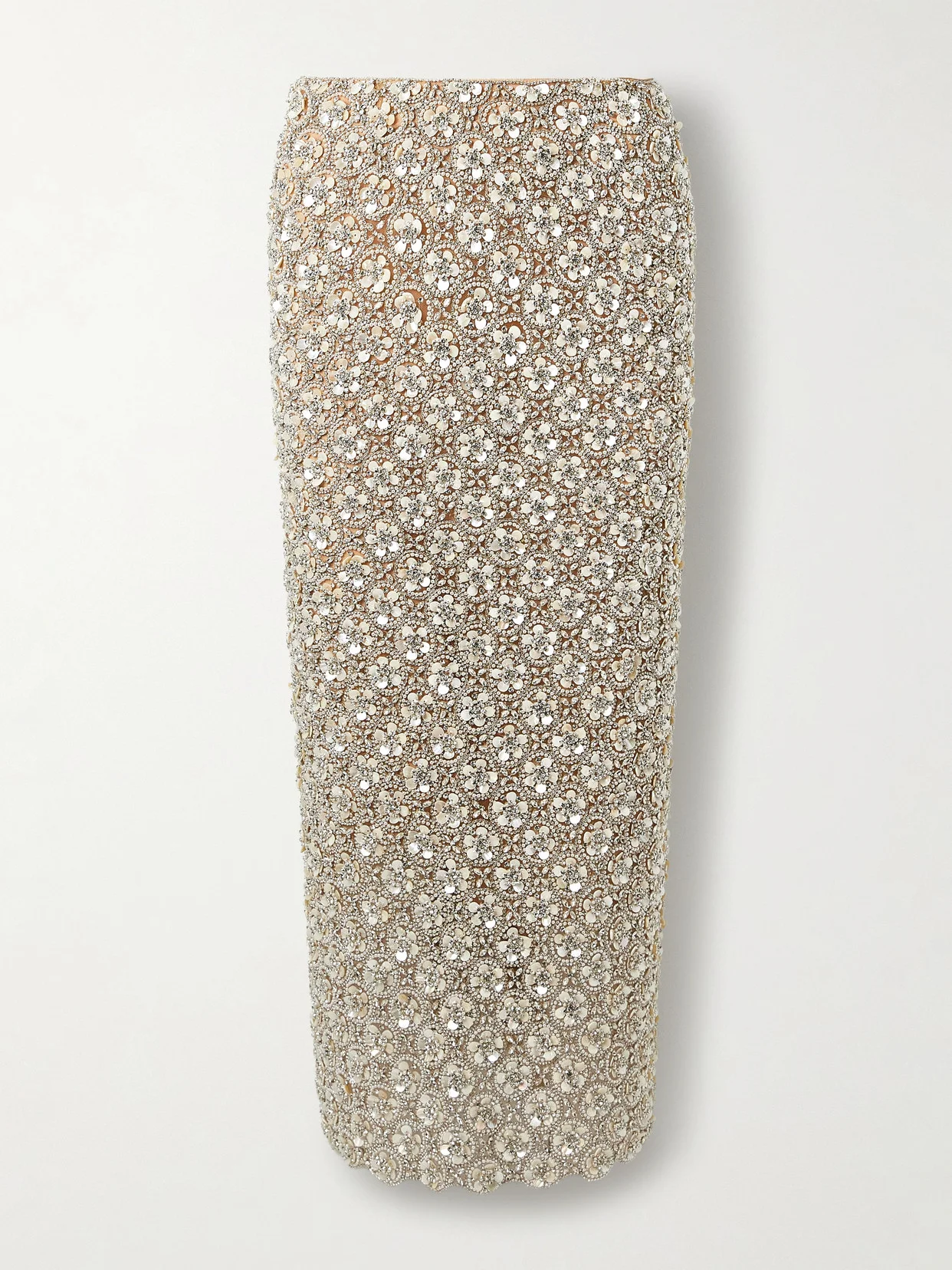 Oscar de la Renta's skirt is embellished with crystals and faux pearls arranged to depict tiny flowers. It's made from tulle and fully lined for coverage. Wear it on special occasions when you want to make a glamorous statement.