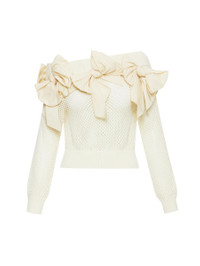 ELEVATE YOUR EVERY DAY WITH THIS COTTON KNIT PULLOVER. FINISHED WITH FAILLE BOWS, THIS OFF-THE-SHOULDER PULLOVER FEATURES A RELAXED SILHOUETTE FOR EASY STYLING. LONG SLEEVES / ONE SHOULDER / PULLOVER STYLE / RELAXED SILHOUETTE / HIP LENGTH / RIBBED TRIM / SEMI-SHEER / UNLINED / DRY LEAN DIMENSIONS: MODEL IS 5'10.5" / 180 CM AND WEARING SIZE S MATERIAL: KNIT: 100% COTTON; BOWS: 100% POLYESTER MADE IN ITALY STYLE 24SN122BOW_ANW