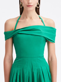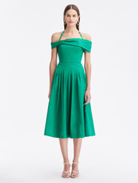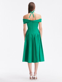 VIBRANTLY HUED, THIS OFF-THE-SHOULDER MIDI DRESS CAPTURES THE JOVIAL SPIRT OF THE PRE-SPRING COLLECTION. MODERNIZED WITH SELF-TIE HALTER STRAPS AND AN ASYMMETRICAL NECKLINE, THIS PIECE WILL STAND THE TEST OF TIME. SELF-TIE HALTER NECKLINE / OFF SHOULDER DROP SLEEVES / SIDE SEAM POCKETS / CONCEALED BACK ZIPPER / UNLINED / DRY CLEAN DIMENSIONS: MODEL IS 5'10.5" / 180 CM AND WEARING SIZE 2 MATERIAL: 98% COTTON, 2% ELASTANE MADE IN ITALY STYLE 24RN224SRN_EMR