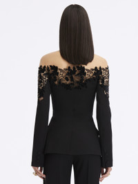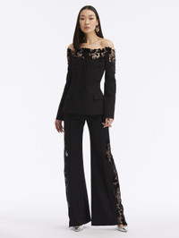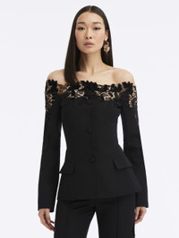 A TIMELESS ADDITION TO YOUR WORKWEAR WARDROBE, THIS OVERLAYER IS CRAFTED FROM LOOPED RIBBON TWEED AND FEATURES A FLORAL VELVET GUIPURE OFF-THE-SHOULDER NECKLINE. OFF SHOULDER / LONG SLEEVES / BUTTON FRONT / DRY CLEAN MATERIAL: 100% VIRGIN WOOL; LINING: 100% SILK MADE IN ITALY STYLE 23FN502GPO_BLK