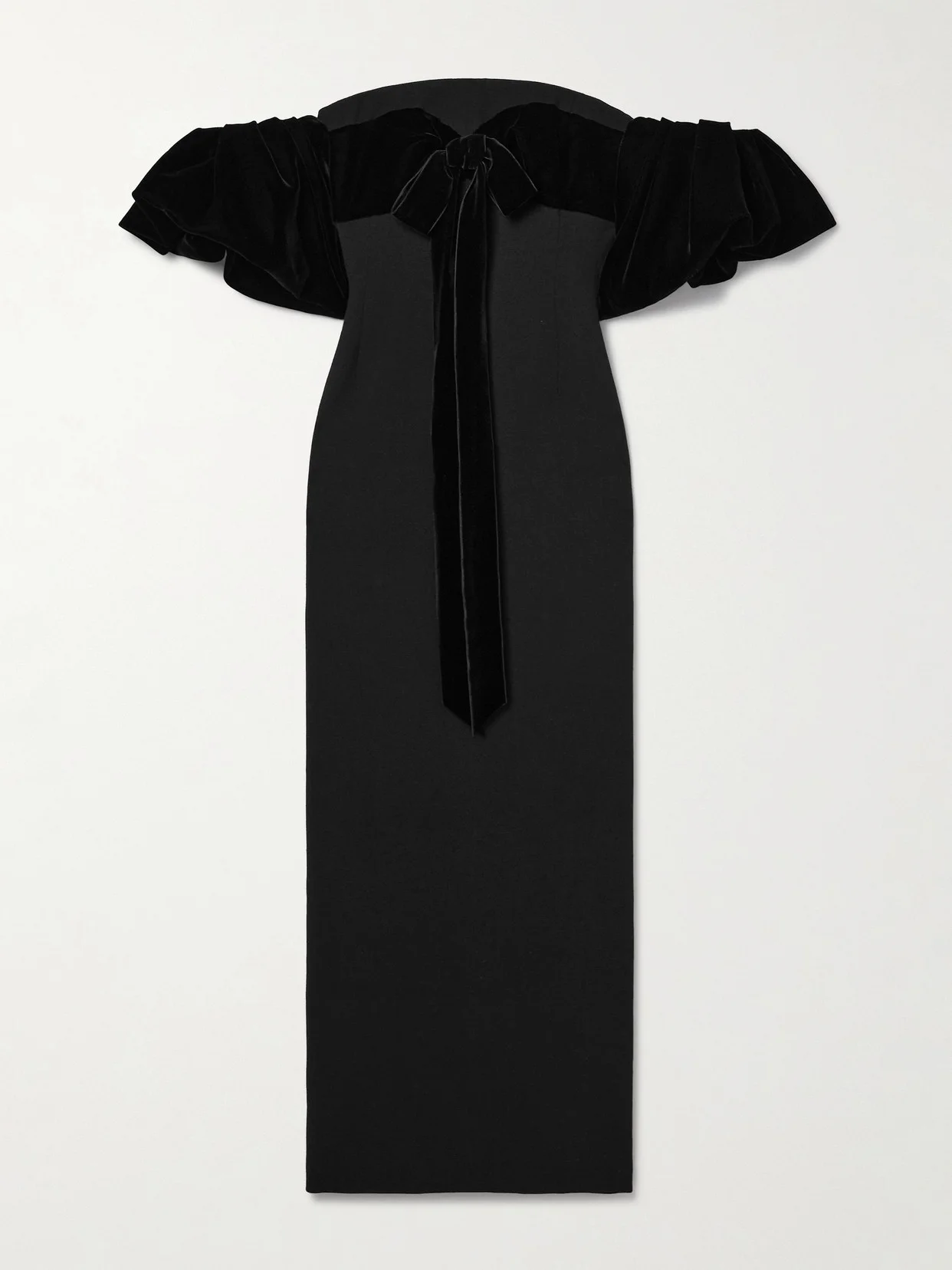You can always rely on Oscar de la Renta to imbue each elegant design with a touch of playful romance. Designed in a column shape from wool-blend cady, this dress has velvet puffed sleeves and a matching bow detail sewn just below the off-the-shoulder neckline. It's fitted with an internal corset for support and has a back vent so you can walk with ease.