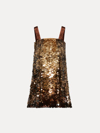 This statement cocktail dress dazzles with all-over gold paillette embroidery, bringing ultimate drama and shine. Velvet shoulder straps add a touch of allure, contrasting the shimmering embellishments for an unforgettable look. Details - Strapless - Square Neckline - Shift Silhouette - Mid-Thigh Length - Concealed Side Zipper - Lined - Style Code: 25RE646TUL_COP Materials & Care - 100% Polyamide