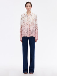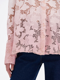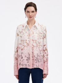 A CHARMING SOLUTION FOR EVERYDAY DRESSING, THIS BLOUSE IS MADE ENTIRELY OF OMBRE PRINTED PEONY GUIPURE LACE. CUT IN AN OVERSIZED SILHOUETTE WITH A CONCEALED BUTTON FRONT AND SHIRT COLLAR, THIS TOP EFFORTLESSLY PAIRS BACK TO DENIM OR TROUSERS. LONG SLEEVES WITH BUTTON CUFFS / SHIRT COLLAR / CONCEALED BUTTON FRONT / RELAXED SILHOUETTE / SEMI SHEER / DRY CLEAN DIMENSIONS: MODEL IS 5'10.5" / 180 CM AND WEARING SIZE 2 MATERIAL: 100% POLYESTER; FRAME: 100% SILK MADE IN USA STYLE 24FN7052OPG_STP