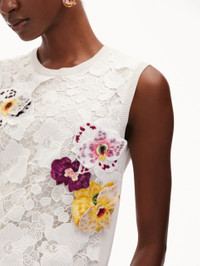 Knit in bright white, this classic tank features an orchid threadwork lace paneled front. This piece is a perfect pairing for color-complementary separates or its coordinating cardigan for optimal versatility. Details - Sleeveless - Crew Neckline - Slim Fit - Hip Length - Pullover Style - Ribbed Trim - Unlined - Style Code: 25RE154EML_WHM Materials & Care - 55% Silk, 45% Viscose; Combo: 100% Polyester