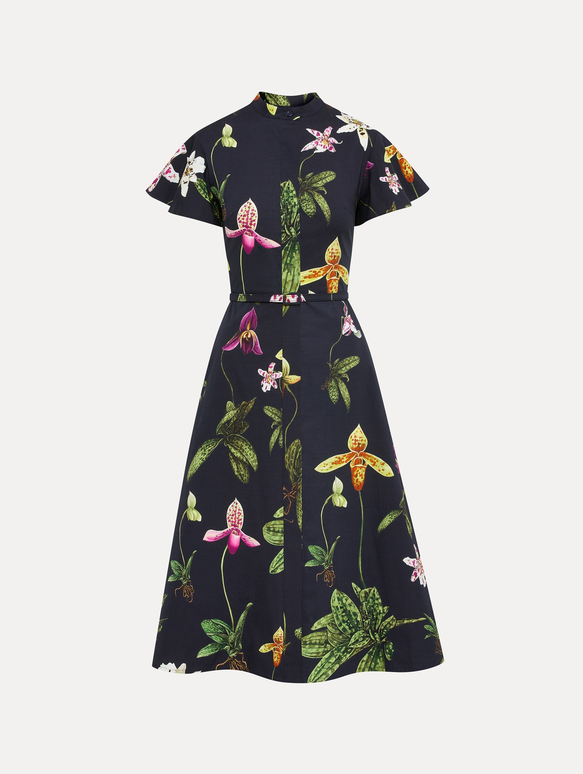 Orchids blossom in full upon this caftan. Crafted from cotton poplin in a soft shade of blue, this piece is complete with a concealed button front and voluminous, short sleeves. Details - Short Sleeves - Banded Collar - Concealed Button Front - Removable, Coordinating Buckle Let with Belt Loops - Side Seam Pockets - Below the Knee Length - 100% Cotton Lining - Style Code: 25RN238ORC_NVM Materials & Care - 97% Cotton, 3% Elastane; Lining: 100% Cotton