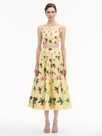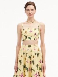 Orchids blossom in full upon this yellow cropped tank. Opt for botanical brilliance and pair it with the coordinating midi skirt. Details - Shoulder Straps - Square Neckline - Concealed Back Zipper - 100% Cotton Lining - Style Code: 25RN728SOL_YLM Materials & Care - 97% Cotton, 3% Elastane; Lining: 100% Cotton