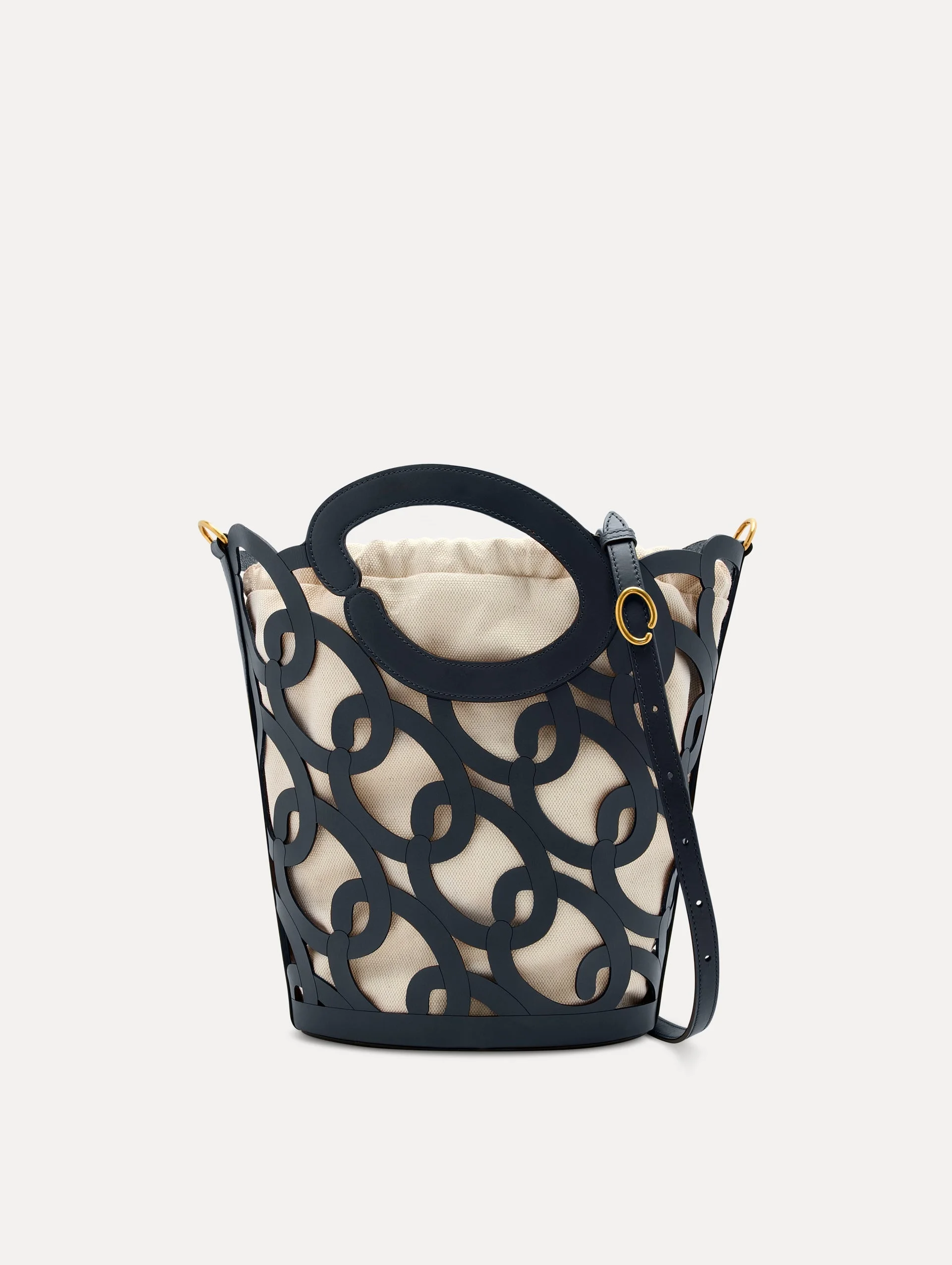 This tote is crafted from Oscar de la Renta’s signature chain-link motif, formed by interlocking 'O' emblems that celebrate the brand’s legacy. A large 'O' forms the top handle, blending function with artistry. Made from eco-friendly vegetable-tanned leather, it includes a removable interior pouch for added versatility. Details - Dimensions: 22 cm x 14 cm x 33 cm - Weight: 980 grams - Short Strap: Top Handle Drop Length 8 cm - Long Strap: Drop Length 55 cm - Drawstring Closure - Top Handles - Adjustable, Detachable Shoulder Strap - Removeable Pouch Interior - Spot Clean - Style Code: 25SH172LSR_NAV - Country of Origin: Italy Materials & Care - 100% Calfskin