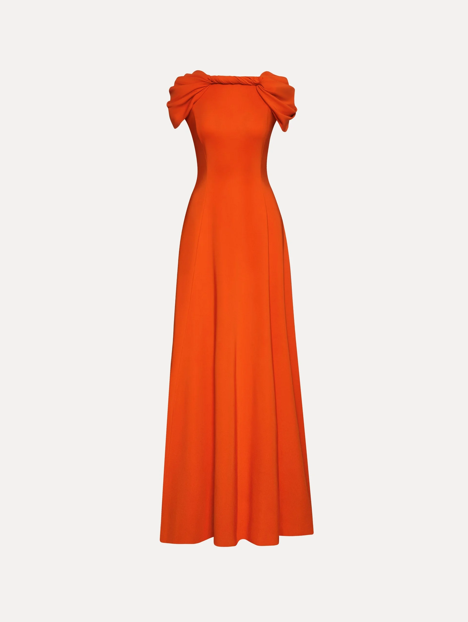 Cut from stretch cady in a striking carnelian hue, this gown is defined by an artful twist-detail neckline that extends into elegant cap sleeves. The silhouette flows effortlessly to a draped back, creating a refined yet fluid effect. Details - Short Sleeves - Twist-Detailed Neckline - Open Back - Concealed Side Zipper - Unlined - Style Code: 25PN062SRY_NEL - Country of Origin: USA Materials & Care - 97% Viscose, 3% Elastane