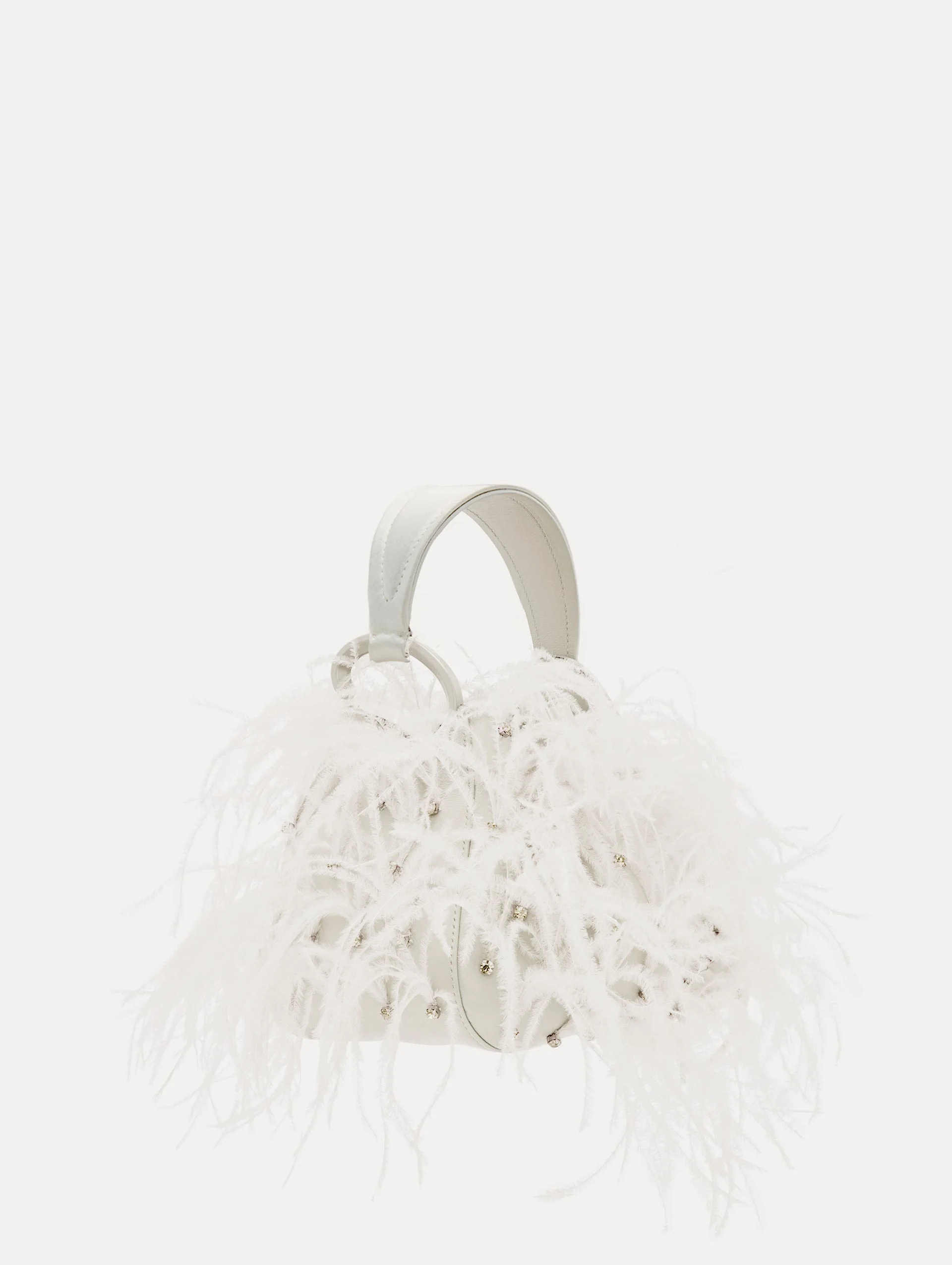 THE SIGNATURE O HANDLE BAG IS EMBOLDNED FOR FALL 2024 OSTRICH FEATHERS ON A WHITE SATIN BASE. CONSTRUCTED IN A TOP HANDLE SILHOUETTE WITH A DRAWSTRING FASTENING AND DETACHABLE CHAIN SHOULDER STRAP, THIS MINI VERSION IS THE PERFECT COMPLIMENT FOR DAY OR NIGHT. TOP HANDLE / DRAWSTRING CLOSURE / DETACHABLE, ADJUSTABLE CHAIN SHOULDER STRAP / IVORY LAMBSKIN INTERIOR / FITS UP TO AN IPHONE 14 PRO MAX / SPOT CLEAN DIMENSIONS: 16 CM X 12 CM X 9 CM WEIGHT: 385 GRAMS SHORT STRAP: TOP HANDLE DROP LENGTH 6 CM LONG STRAP: STRAP LENGTH 120 CM / DROP LENGTH 58 CM MATERIAL: 95% SATIN, 5% LAMBSKIN MADE IN ITALY STYLE 24FH102EMB_IVR