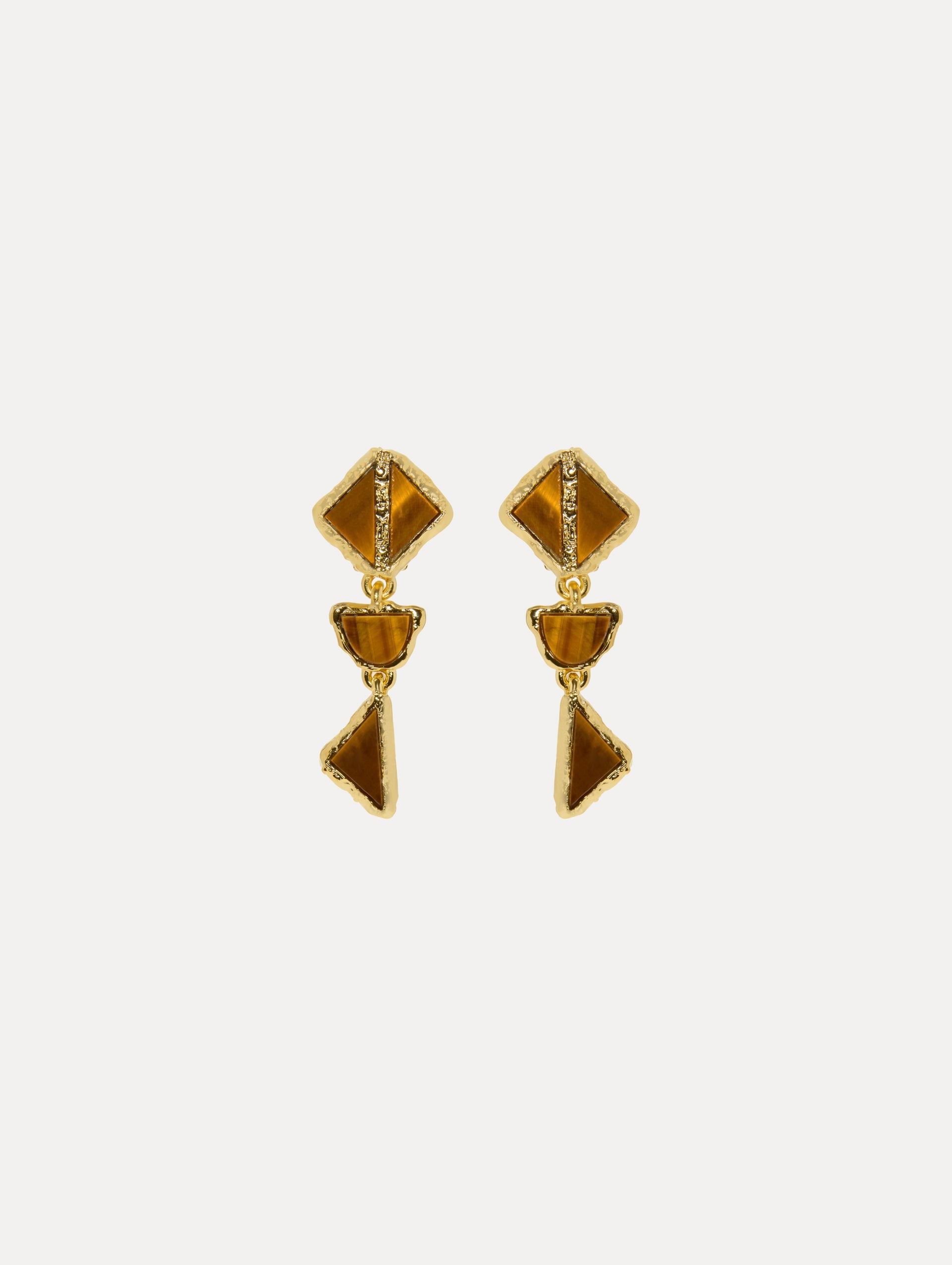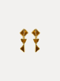 These hoop earrings feature semi-precious stones of varying cuts set in gold-tone hardware, creating a dimensional drop silhouette. The texture of the setting adds a touch of organic elegance, contrasting the polished stones. Details - Dimensions: 2 x .75" - Weight: 10 grams - Clip Backs with Comfort Pads - Semi-Precious Stone from China - Style Code: R25J119_TGE Materials & Care - 80% Pewter, 15% Semi-Precious Stone, 4% Brass, 1% Gold