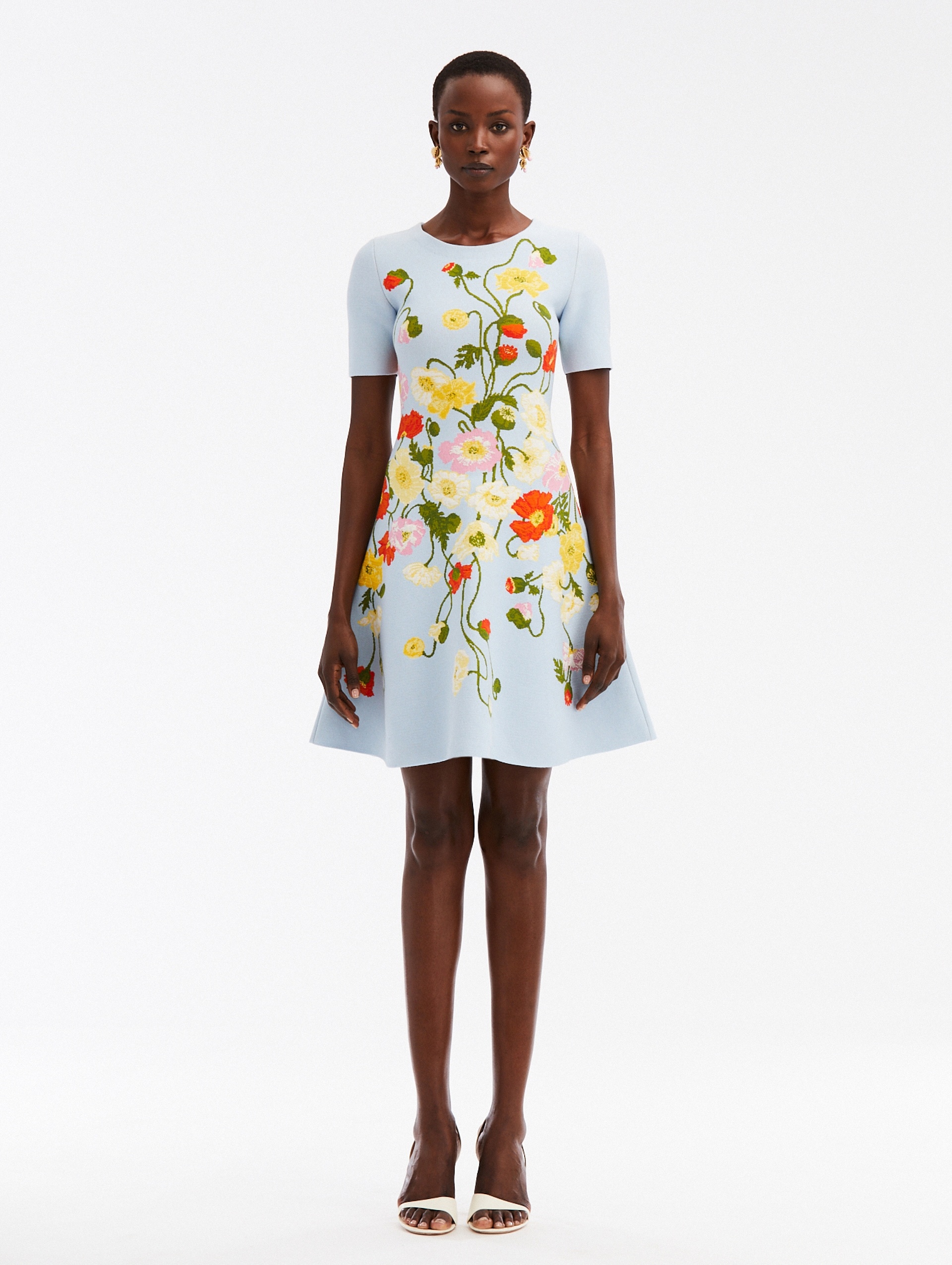 A HOUSE-FAVORITE IS REIMAGINED SEASONALLY. THIS JACQUARD KNIT DRESS IS DEFINED BY THIS SEASON'S SIGNATURE PAINTED POPPIES MOTIF. IN VIBRANT HUES, THIS FIT-AND-FLARE STYLE BOASTS A JEWEL NECKLINE AND SOFTLY FLARED SKIRT. SLEEVELESS / ROUND NECKLINE / FIT-AND-FLARE SILHOUETTE / MID-THIGH LENGTH / CONCEALED BACK ZIPPER / UNLINED / DRY CLEAN DIMENSIONS: MODEL IS 5'10.5" / 180 CM AND WEARING SIZE S MATERIAL: 71% VISCOSE, 24% POLYESTER, 4% POLYAMIDE, 1% ELASTANE MADE IN ITALY STYLE 24SN112PPD_LBM