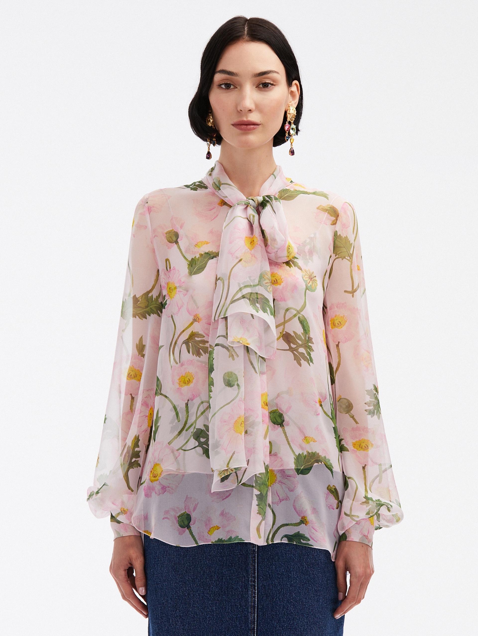 PAINTED POPPIES TIE-NECK CHIFFON BLOUSE