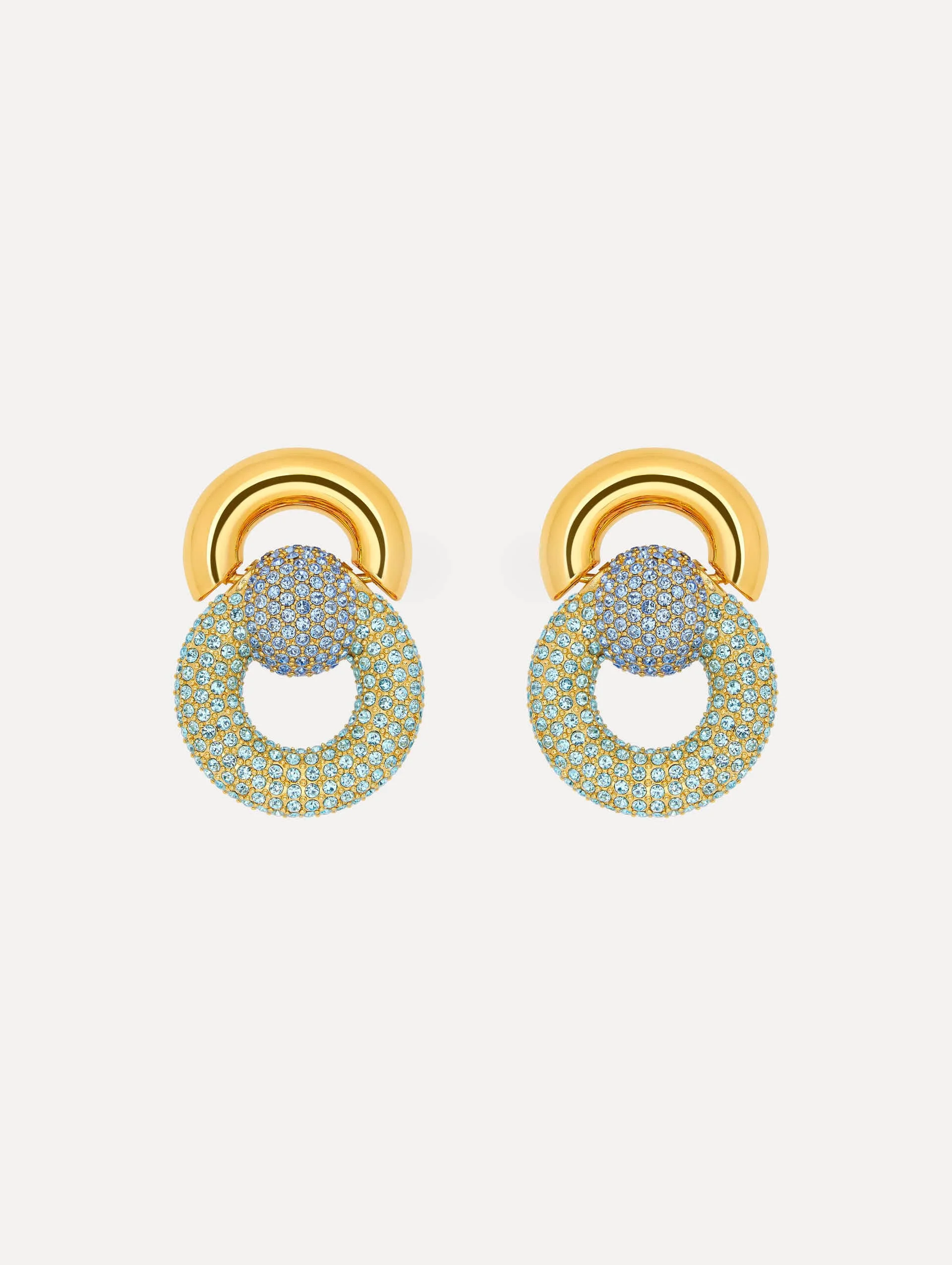 These sculptural drop earrings pair polished gold rings with pave-encrusted spheres. The bold, interlocked design brings a refined sense of structure and a striking shimmer to any look. Details - Dimensions: 29 mm x 27 mm - Weight: 23 grams - Clip Backs with Comfort Pads - European Glass Crystals - Style Code: F25J921_LSP - Country of Origin: Italy Materials & Care - - 97% Brass, 3% Crystal Glass - - Avoid exposing your jewelry to harsh chemicals. - - Lotions, cosmetics, hairspray and perfumes can cause chemical reactions that can cause the finish to deteriorate. - - Before handling, washing hands after applying makeup and hair products will help to preserve the finish. - - Do not wear in the pool, on the beach or in the shower. - - Wipe away dirt and body oils with a slightly damp microfiber jewelry cloth or cotton ball and allow to dry. - - Store separately in cloth pouches or small boxes to minimize scratching.