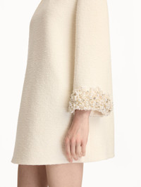 This shift dress is framed by luminous pearl and crystal cluster embroidery at the neckline and cuffs. The clean, streamlined silhouette allows the embellishment to shine, bringing a touch of radiance to its refined simplicity. Details - Long Sleeves - Jewel Neckline - Shift Silhouette - Concealed Back Zipper - 100% Silk Lining - Country of Origin: Italy - Style Code: 26RE647CWD_IVR Materials & Care - 64% Cotton, 27% Virgin Wool, 9% Polyamide; Lining: 100% Silk - Spot clean only - Do not dry clean, iron, steam, bleach, or wash