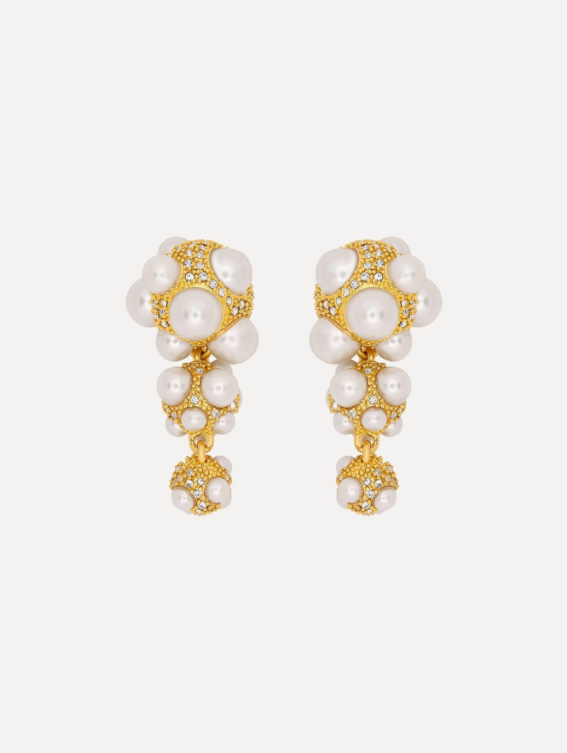 These triple drop earrings feature clusters of lustrous faux pearls nestled in gold-tone settings, each sphere adorned with glistening pave crystals—the cascading silhouette creates a sense of movement and depth. Details - Dimensions: 4.5 cm x 2cm - Weight: 14 grams - Post Backs - For Pierced Ears - European Glass Crystals - Style Code: F25J940_PRL - Country of Origin: Italy Materials & Care - - 97% Brass, 2% Plastic Pearl, 1% Crystal Glass - - Avoid exposing your jewelry to harsh chemicals. - - Lotions, cosmetics, hairspray and perfumes can cause chemical reactions that can cause the finish to deteriorate. - - Before handling, washing hands after applying makeup and hair products will help to preserve the finish. - - Do not wear in the pool, on the beach or in the shower. - - Wipe away dirt and body oils with a slightly damp microfiber jewelry cloth or cotton ball and allow to dry. - - Store separately in cloth pouches or small boxes to minimize scratching.