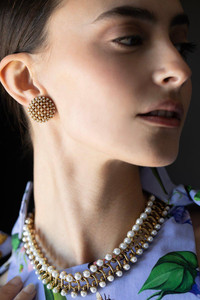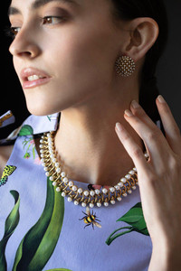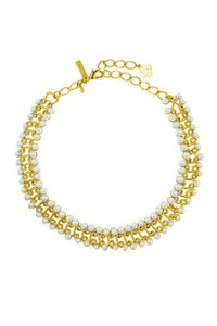 DETAILS AND INSIGHT Oscar De La Renta pearl small link necklace in gold. DIMENSIONS: 4" EXTENDER CHAIN / LOBSTER CLASP / CRYSTAL PEARL FROM AUSTRIA MATERIAL: PEWTER, CRYSTAL GLASS, BRASS, GOLD Made in USA Style S23J014