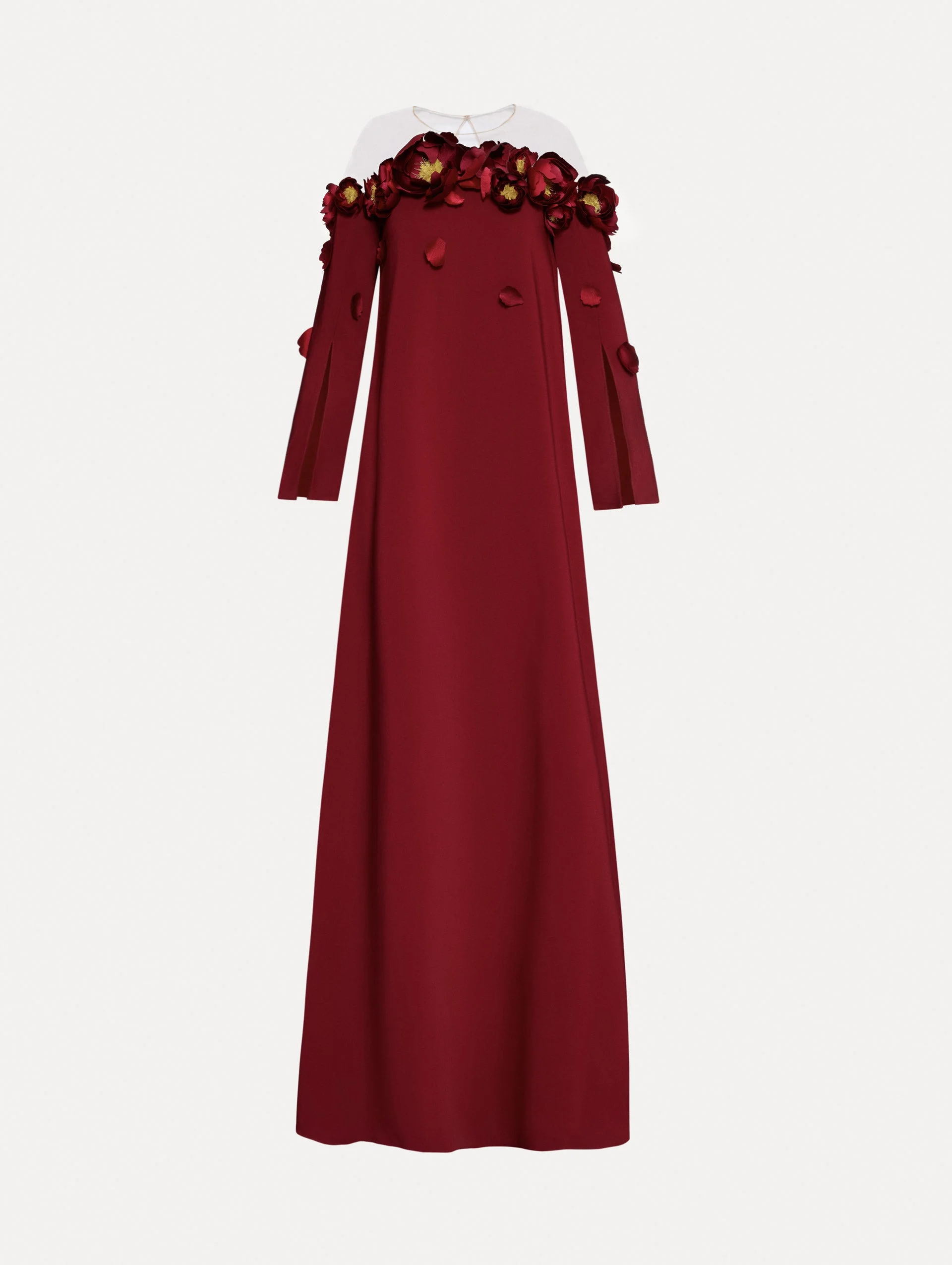 True to the house’s reverence for flora, this illusion neckline caftan is adorned with sculptural peony appliques—each bloom meticulously crafted by hand to echo the beauty of nature in full bloom. Cut in a classic, relaxed silhouette with elegant split sleeves, the design blends ease with artistry. Details - Long Split Sleeves - Illusion Neckline - Keyhole Back Closure - Concealed Back Zipper - Unlined - Style Code: 25FE914SRY_TER - Country of Origin: India Materials & Care - - 97% Viscose, 3% Elastane; Frame: 100% Polyamide - - Spot clean only. - - Do not dry clean, iron, steam, bleach, or wash.