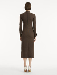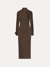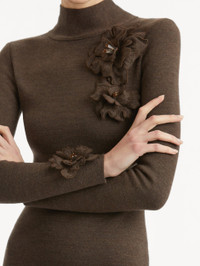 A knit dress in deep dark brown, designed in pencil silhouette, exudes understated sophistication. The mock neck enhances its refined structure, while tonal peony appliques, each adorned with intricate beaded detailing, frame the neckline and sleeves. Details - Long Sleeves - Mock Neckline - Slim Fit - Concealed Back Zipper - Unlined - Style Code: 25FE141MNM_DKB - Country of Origin: Italy Materials & Care - - 96% Virgin Wool, 3% Polyamide, 1% Elastane - - Spot clean only. - - Do not dry clean, iron, steam, bleach, or wash.