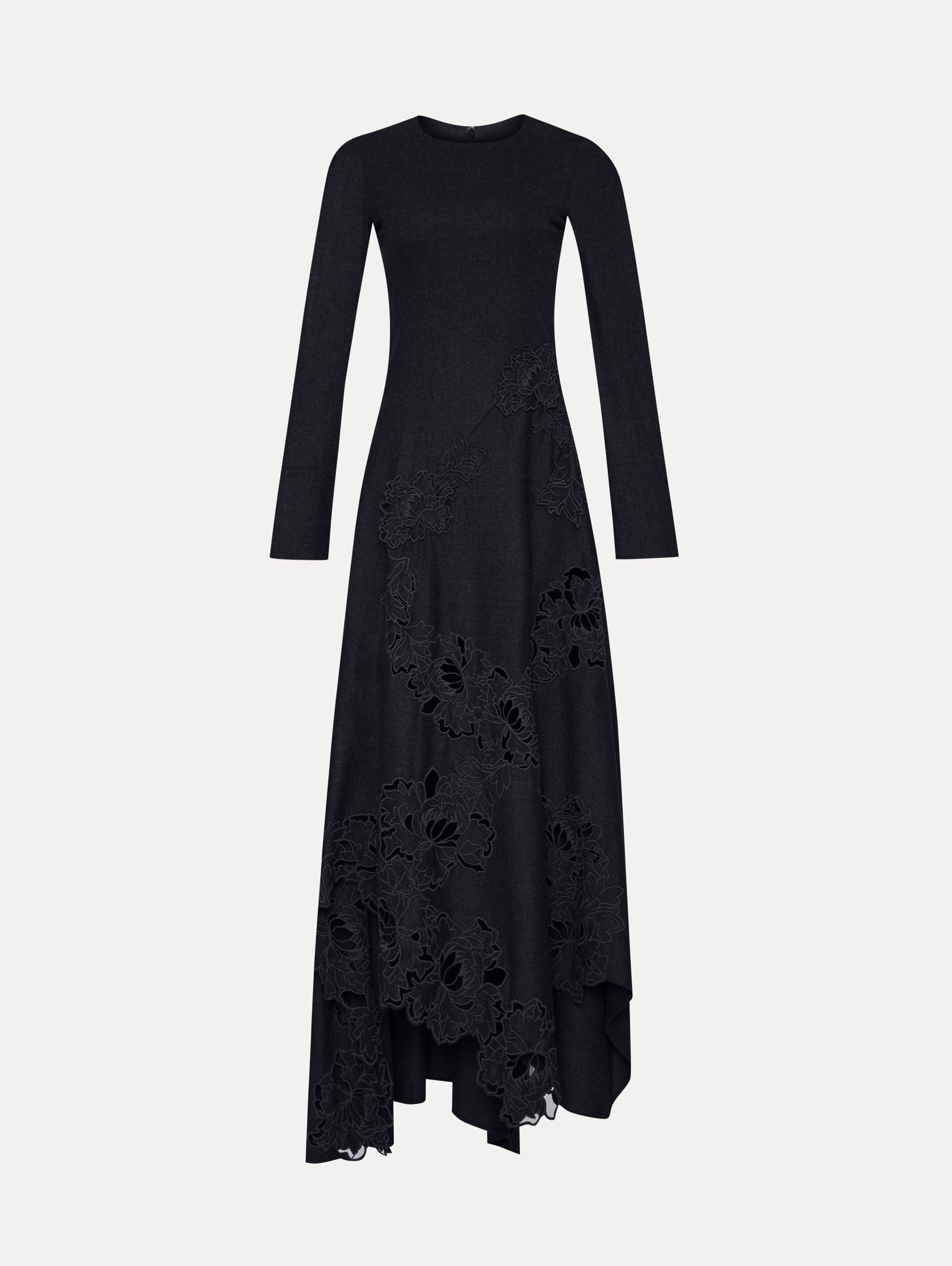 Crafted from virgin wool in a deep shade of charcoal, this dress is defined by perfectly placed peony guipure lace appliques. With an asymmetrical hem and long sleeves, this dress is both a statement and a staple. Details - Long Sleeves with Button Cuffs - Jewel Neckline - Asymmetrical Hemline - Concealed Back Zipper - Unlined - Style Code: 24FE237WA_CCL Materials & Care - 98% Virgin Wool, 2% Elastane