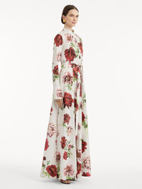 Printed with blooming peonies, this cotton poplin caftan brings the flower's inherent beauty to the fore. The long-sleeve silhouette features a full-length skirt, waist sash, and banded collar—offering a fresh, feminine take on effortless day dressing. Details - Long Sleeves with Button Cuffs - Banded Collar - Concealed Button Front - Self-Tie Sash - Unlined - Style Code: 25FN922PMN_IMU - Country of Origin: Italy Materials & Care - - 97% Cotton, 3% Elastane - - Dry clean only.