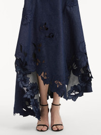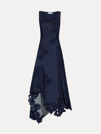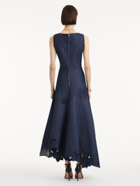 This denim dress reimagines classic florals with tonal peony threadwork cutouts. The fit-and-flare silhouette is finished with a hand-cut asymmetrical hem, blending structure with soft, artful detail. Details - Sleeveless - Scoop Neckline - Asymmetrical Hemline - Concealed Back Zipper - Unlined - Style Code: 25FE214SDE_DDM - Country of Origin: Italy Materials & Care - 98% Cotton, 2% Elastane; Binding: 100% Silk - Spot clean only. - Do not dry clean, iron, steam, bleach, or wash.