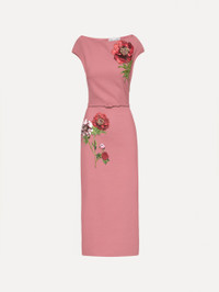 This silhouette is refined yet feminine, featuring a bateau neckline, cap sleeves, and a belted waist. Dimensional peony embroidery blooms across the bodice and skirt—each flower intricately rendered in rich threadwork to evoke painterly depth. Details - Cap Sleeves - Bateau Neckline - Slim Fit - Removable, Coordinating Buckle Belt with Belt Loops - Concealed Back Zipper - Center Back Slit - Unlined - Style Code: 25FE609DSW_CYH - Country of Origin: Italy Materials & Care - - 94% Virgin Wool, 5% Elastane, 1% Polyamide - - Spot clean only. - - Do not dry clean, iron, steam, bleach, or wash.