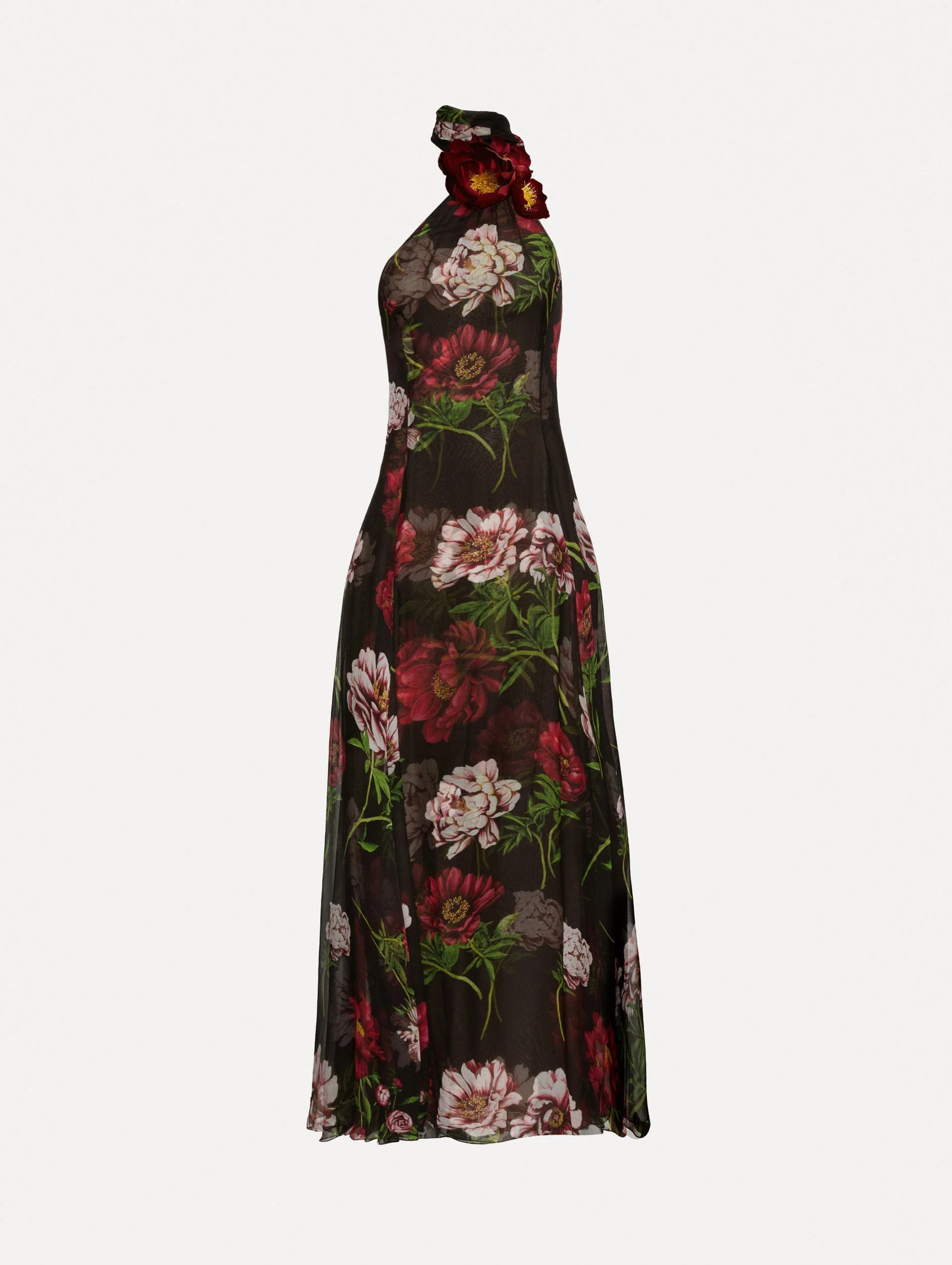 This silk chiffon gown stuns with large-scale peonies in rich, autumnal hues. A wrap-style halter neckline ties like a scarf, falling into a soft train down the back, while a dimensional peony applique at the neck adds a sculptural finishing touch. Details - Sleeveless - Halter Neckline with Scarf Detail - Open Back Concealed Back Zipper - Semi-Sheer - Lined - Style Code: 25FE012PMG_BRU - Country of Origin: Italy Materials & Care - - 100% Silk - - Spot clean only. - - Do not dry clean, iron, steam, bleach, or wash.