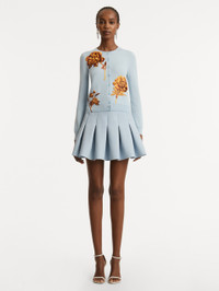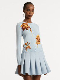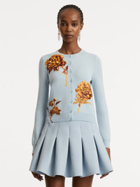 A house-favorite is reimagined with peony threadwork embroidery. Knit from soft wool, this classic cardigan boasts a slim fit and crew neckline. It is the perfect overlayer for day dresses and casual tees alike. Details - Long Sleeves - Crew Neckline - Button Front - Ribbed Trim - Unlined - Style Code: 25FE145OEP_IYB - Country of Origin: Italy Materials & Care - - 100% Wool - - Spot clean only. - - Do not dry clean, iron, steam, bleach, or wash.